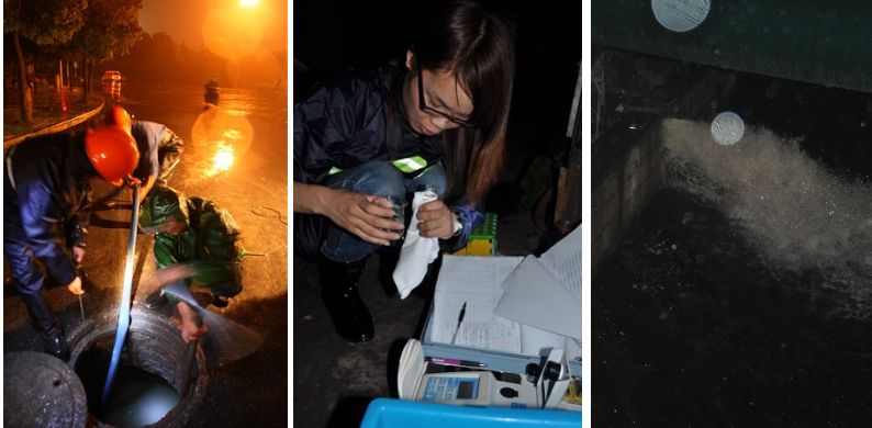 (圖為工作人員進行沖洗排放前的關閥門操作及對排放口水質化驗工作)