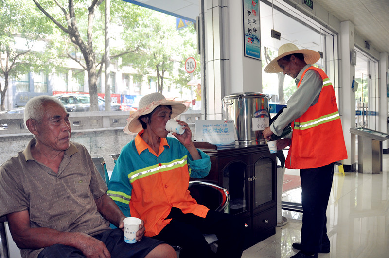 今年6月以來,供水公司積極響應(yīng)浙江之聲廣播電臺發(fā)起的“一杯水”大型公益活動,在全區(qū)13個供水營業(yè)大廳設(shè)置了免費供水點,并配備了醫(yī)藥箱,為高溫下的環(huán)衛(wèi)工人、交警、路政、快遞員等一線勞動者提供一處納涼地。公司已連續(xù)三年開展該活動,目前已累計提供9000多次服務(wù)。圖為三位老人正在城區(qū)供水營業(yè)廳飲用茶水。