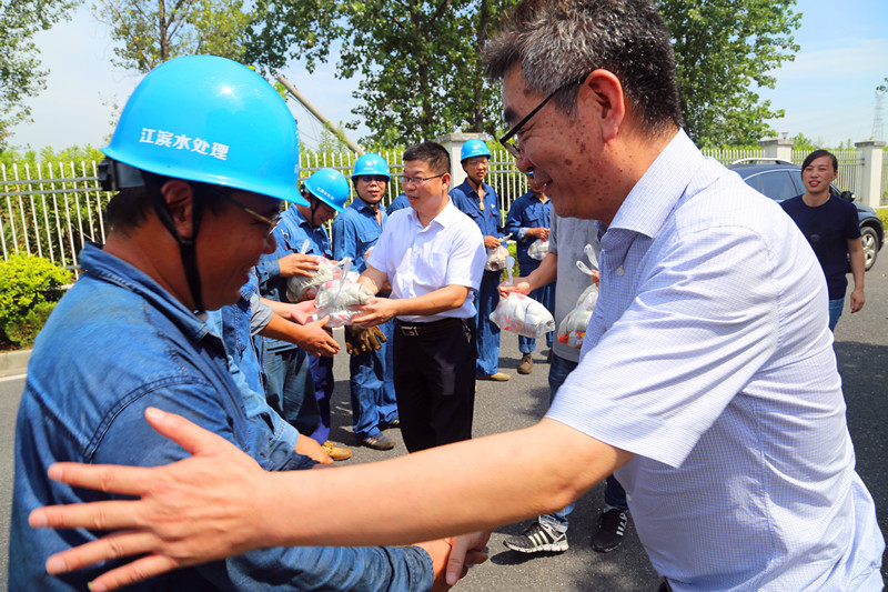 圖為集團副總經理張則再在江濱水處理公司一體化生化池機修現場慰問運行工人