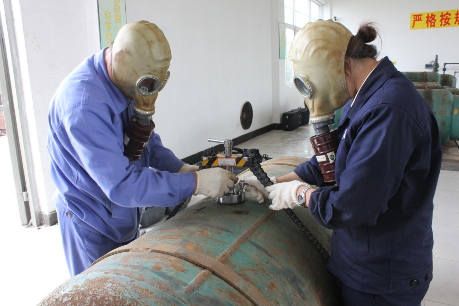 9名員工參與了此次演練。兩人一組,從新舊空氣呼吸器和防化服的正確穿戴及使用、泄氯堵漏工具的使用以及氯瓶拆裝三個項目進行技術(shù)演練。演練從實戰(zhàn)出發(fā),參演人員各司其職,按照“正確、迅速”的原則,圓滿地完成了本次演練任務(wù),最后公司運行部副經(jīng)理對參演人員按標(biāo)準(zhǔn)進行了評分考核并發(fā)表總結(jié)講話。