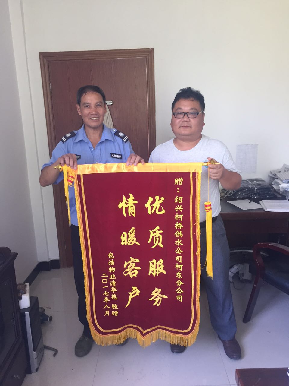 825日,平水鎮清華苑包潔物業專程送來錦旗,感謝柯東分公司提供的優質服務。