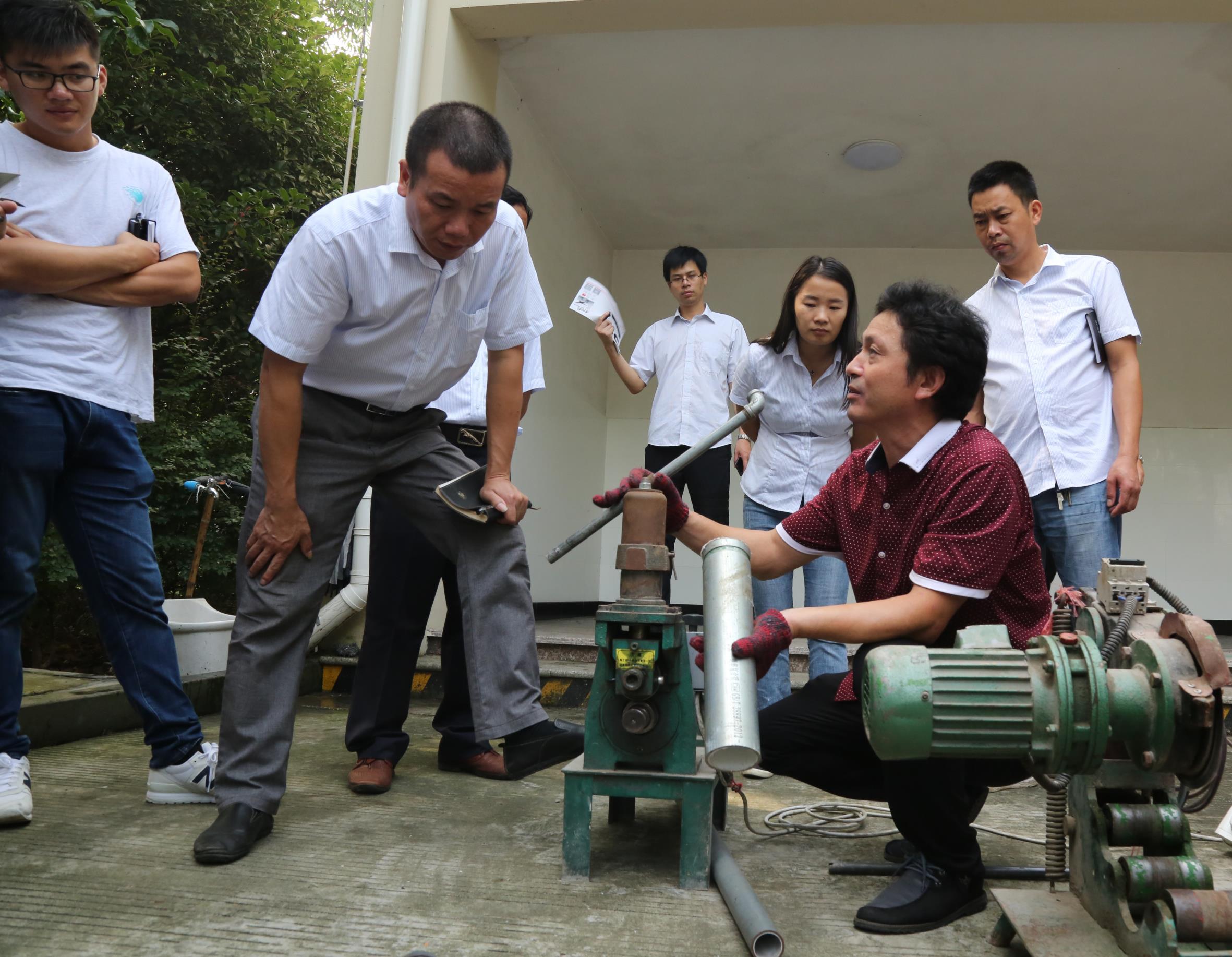 培訓主要圍繞鋼塑管開槽施工操作、配件和鋼塑管的連接工藝展拉開,廠方技術人員示范操作結束后,還讓每位在場受訓人員對不同口徑的鋼塑管開槽與連接進行了模擬操作。
